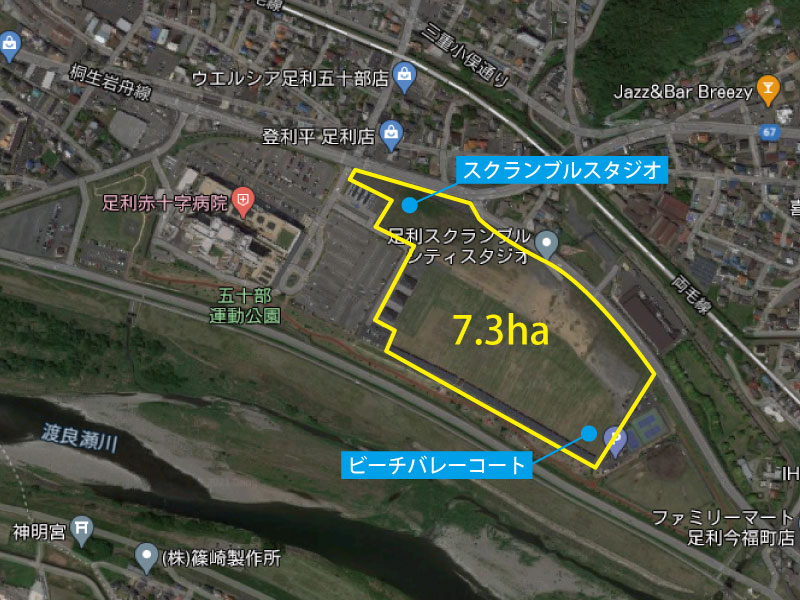足利市が所有する用途が決まっていない土地で、最も広いものが「競馬場跡地」です。全体で20haにも及ぶ敷地には、2011年に足利赤十字病院が開院し、南側に東西に細長い五十部運動公園、東側に野球場とバスケットボールコートが整備されています。それでも7.3haが残っており、実質「塩漬け」状態となっています。