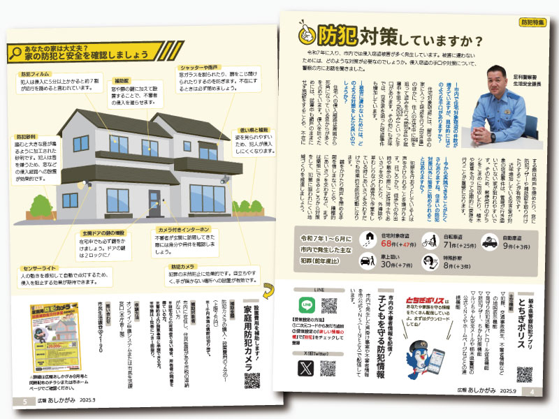 足利市の広報誌「あしかがみ(R7年9月号)」に防犯特集が掲載されました。